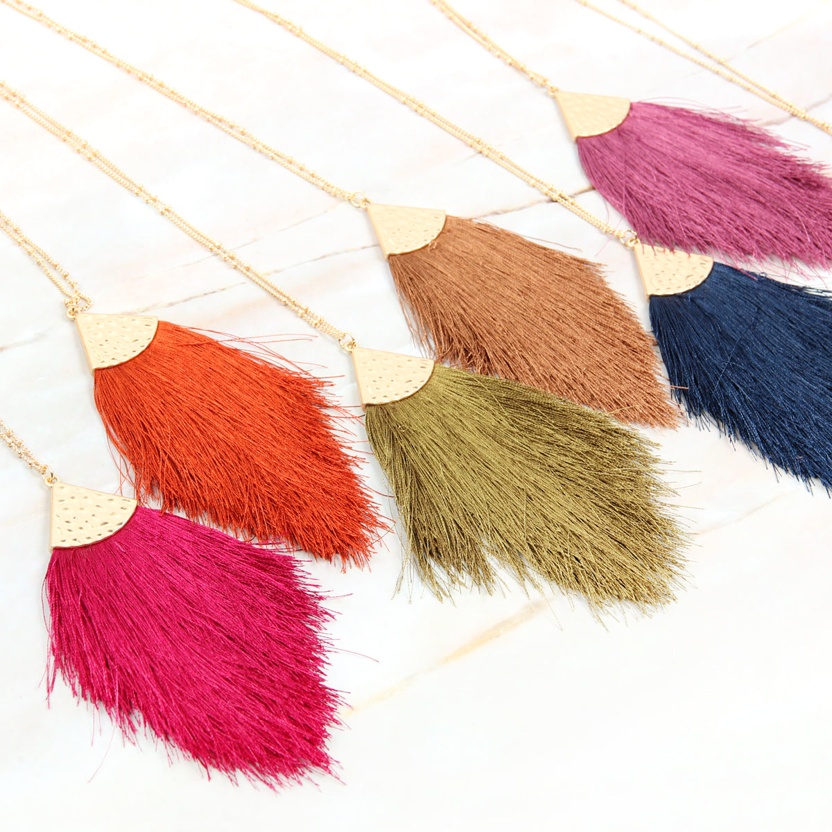 Bold and exciting, this long-line tassel necklace is anything but subtle. Set on a long, gold-tone chain and tonal fringe fanning out across the bottom, pairs perfect with a solid-color top, and let it do what it does best! Statement!